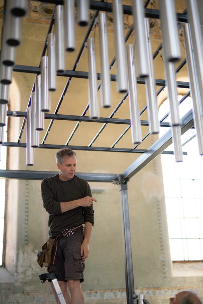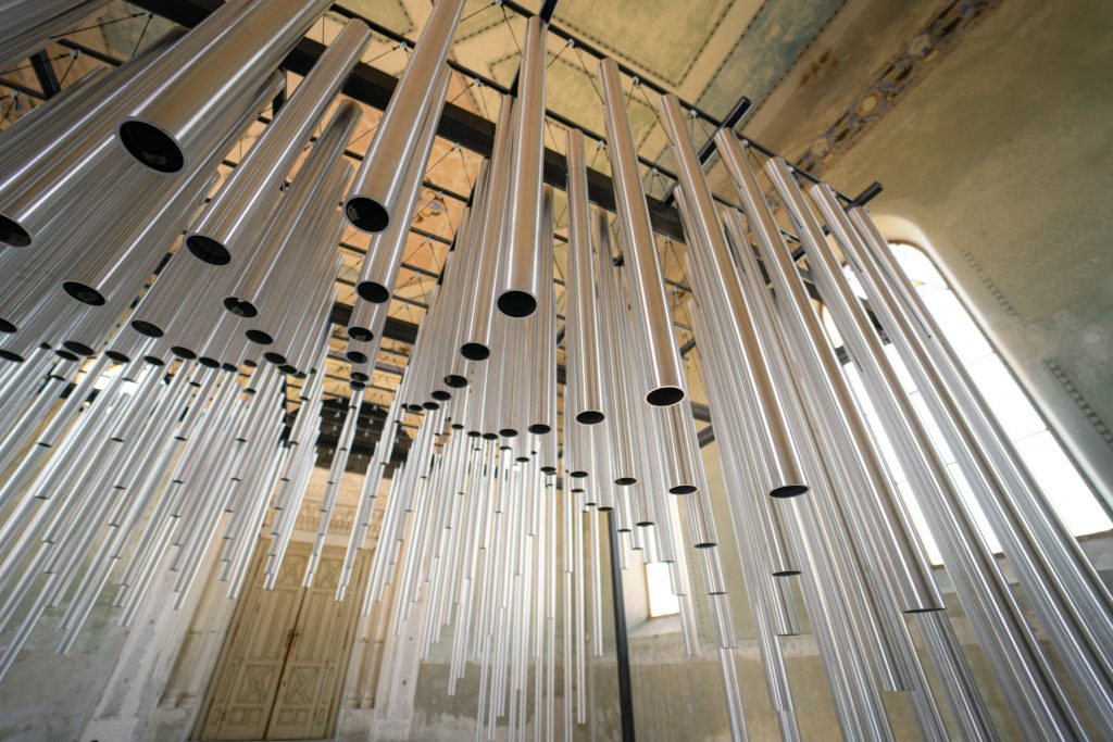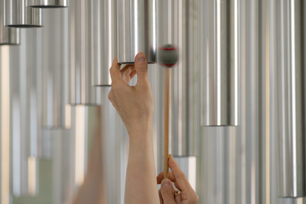 Within this structure, 256 aluminum tubes are suspended freely, forming a three-dimensional matrix of harmonic relationships.