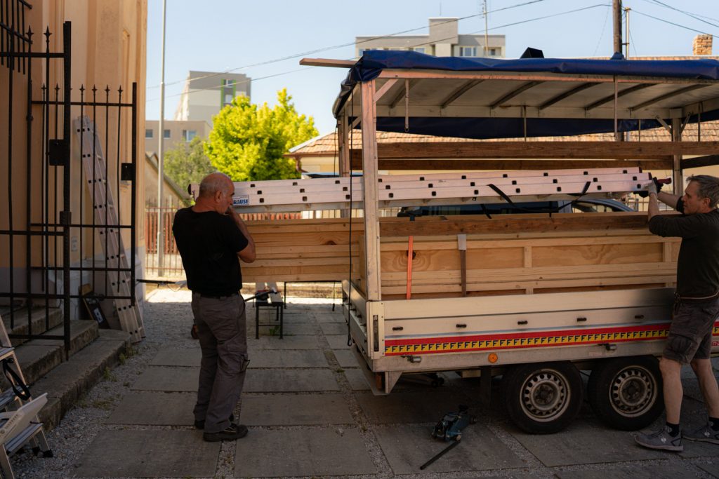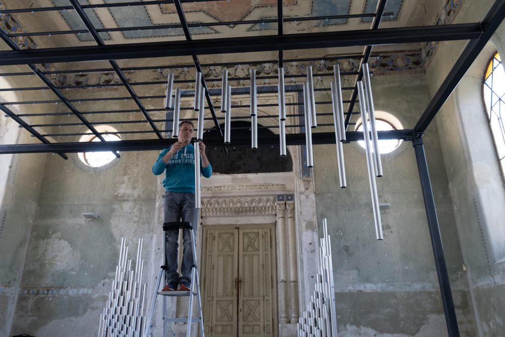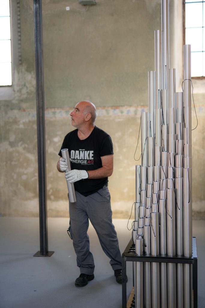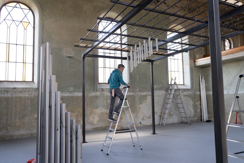 Each tube is suspended using cords and hooks according to a precise order system. Because the tubes are visually similar, their correct placement is essential — even small deviations would disrupt the harmonic relationships of the structure.